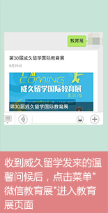 参加威久留学微信教育展,足不出户就可享受资深留学专家一对一服务。攻克留学申请难题,制定专属留学方案,获取国外院校最新招生信息,了解最前沿的留学资讯,动动手指,一切精彩由你"掌"握!
